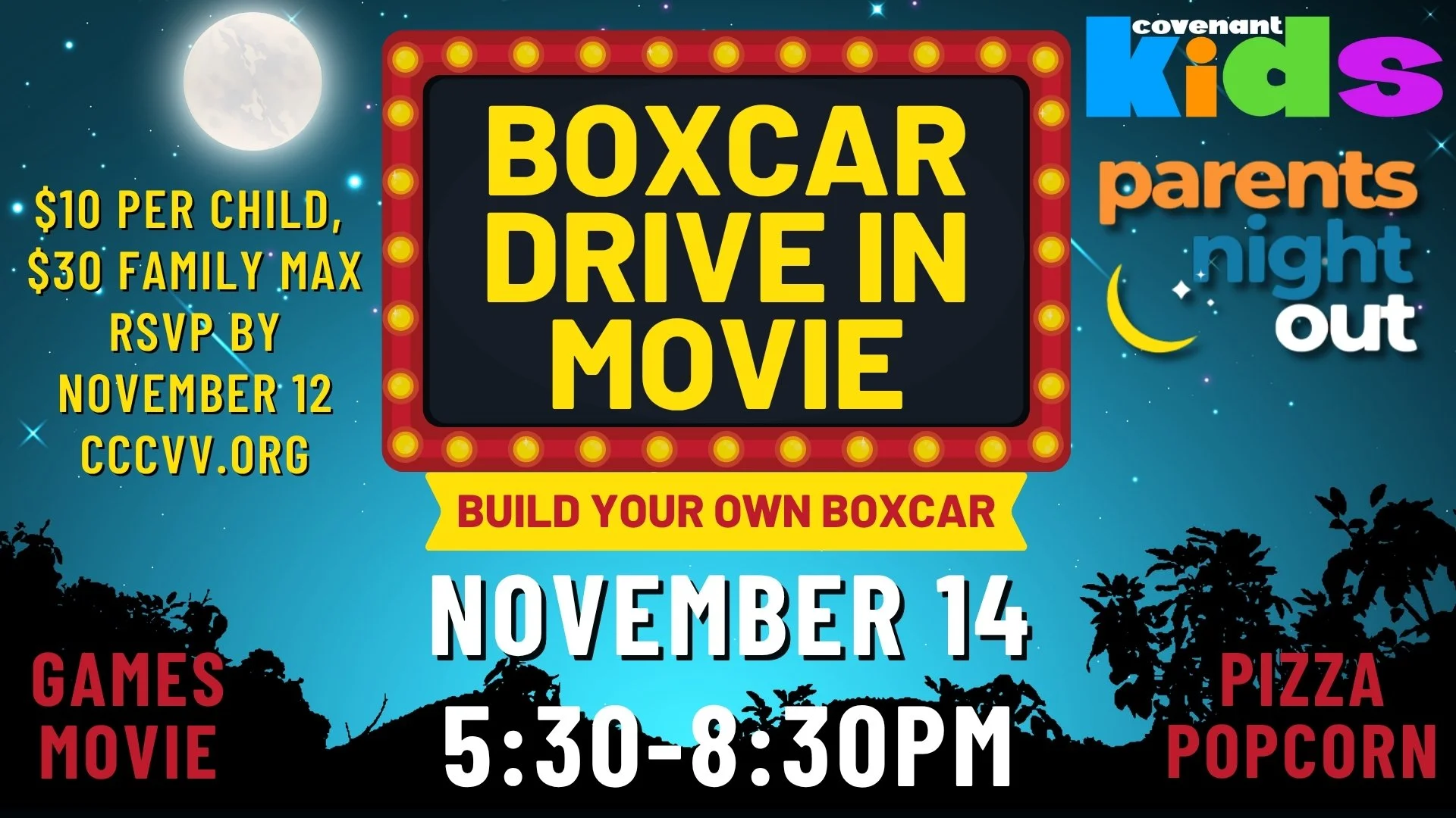 Parents, are you ready for some kid free time? Go out to dinner, have an uninterrupted conversation, maybe just take a nap. Sign your kids up, November 14, 5:30-8:30. We'll eat pizza & popcorn, build a boxcar, watch a movie and hear about how much God loves them. The cost is $10 per child with a $30 max per family.