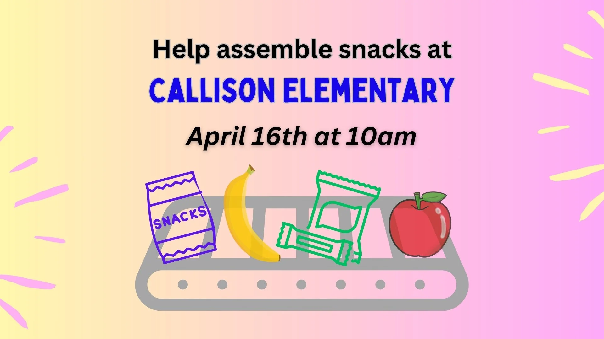 Join us Thursday, April 16th at 10am, as we continue our partnership with Callison Elementary and help assemble snacks for the students during testing.