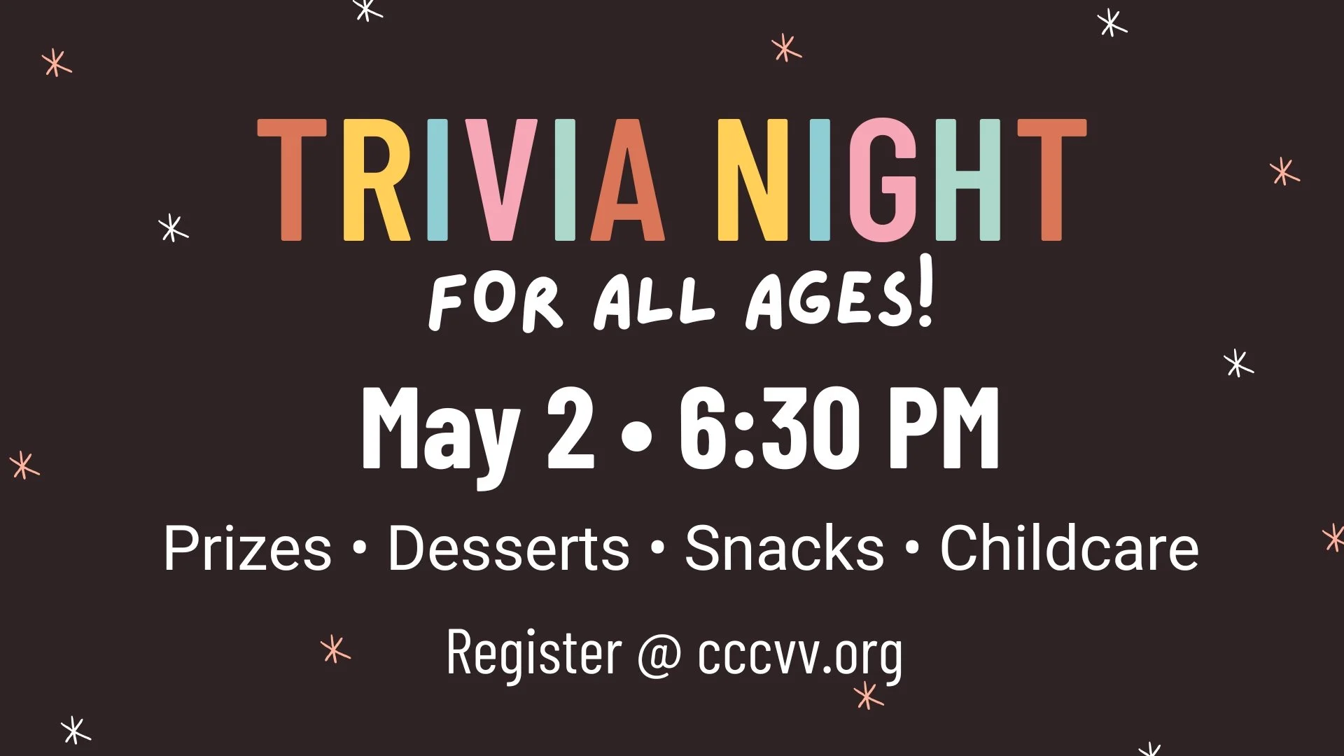 Bring the whole family for a fun-filled Trivia Night For All Ages! Enjoy some friendly competition with questions for all ages, tasty snacks. Childcare is available so everyone can relax and participate. May 2nd @ 6:30 in the Worship Center!