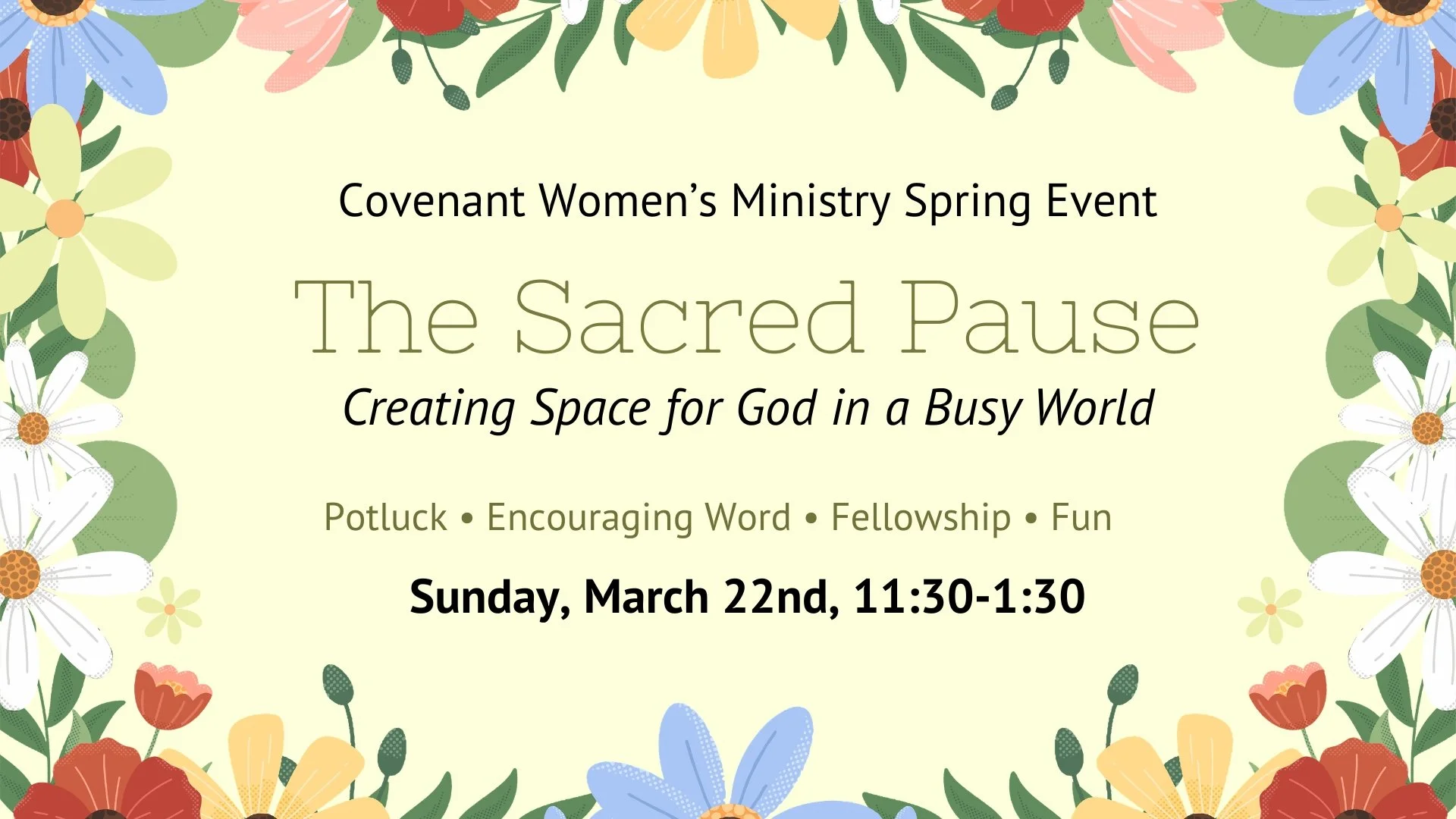 Join us, Sunday, March 22 at 11:30am, for the Women's Spring Event. It'll be a fun and relaxing afternoon. Enjoy a potluck lunch and an encouraging word. Don't forget to invite a friend! Childcare available upon request.